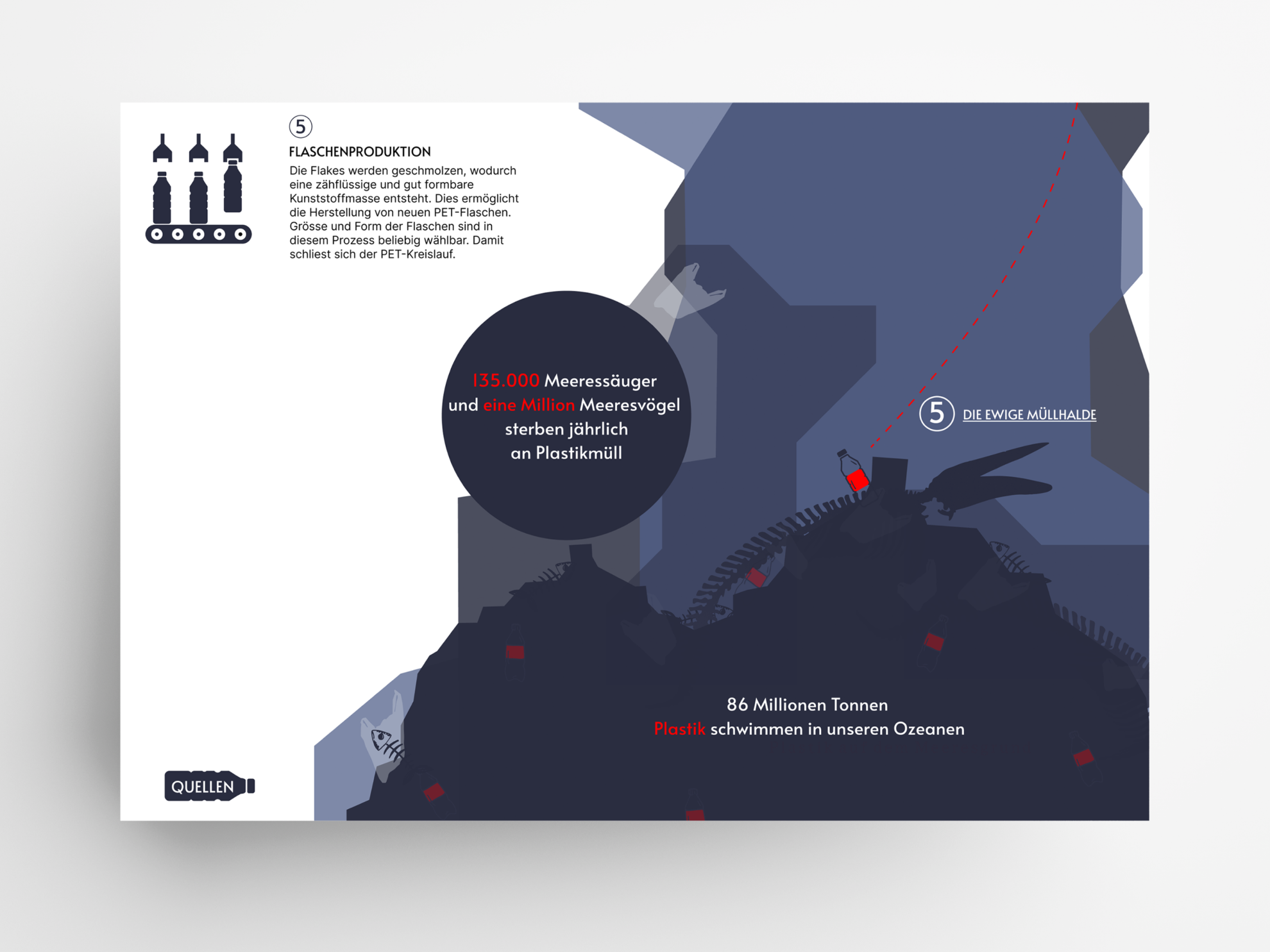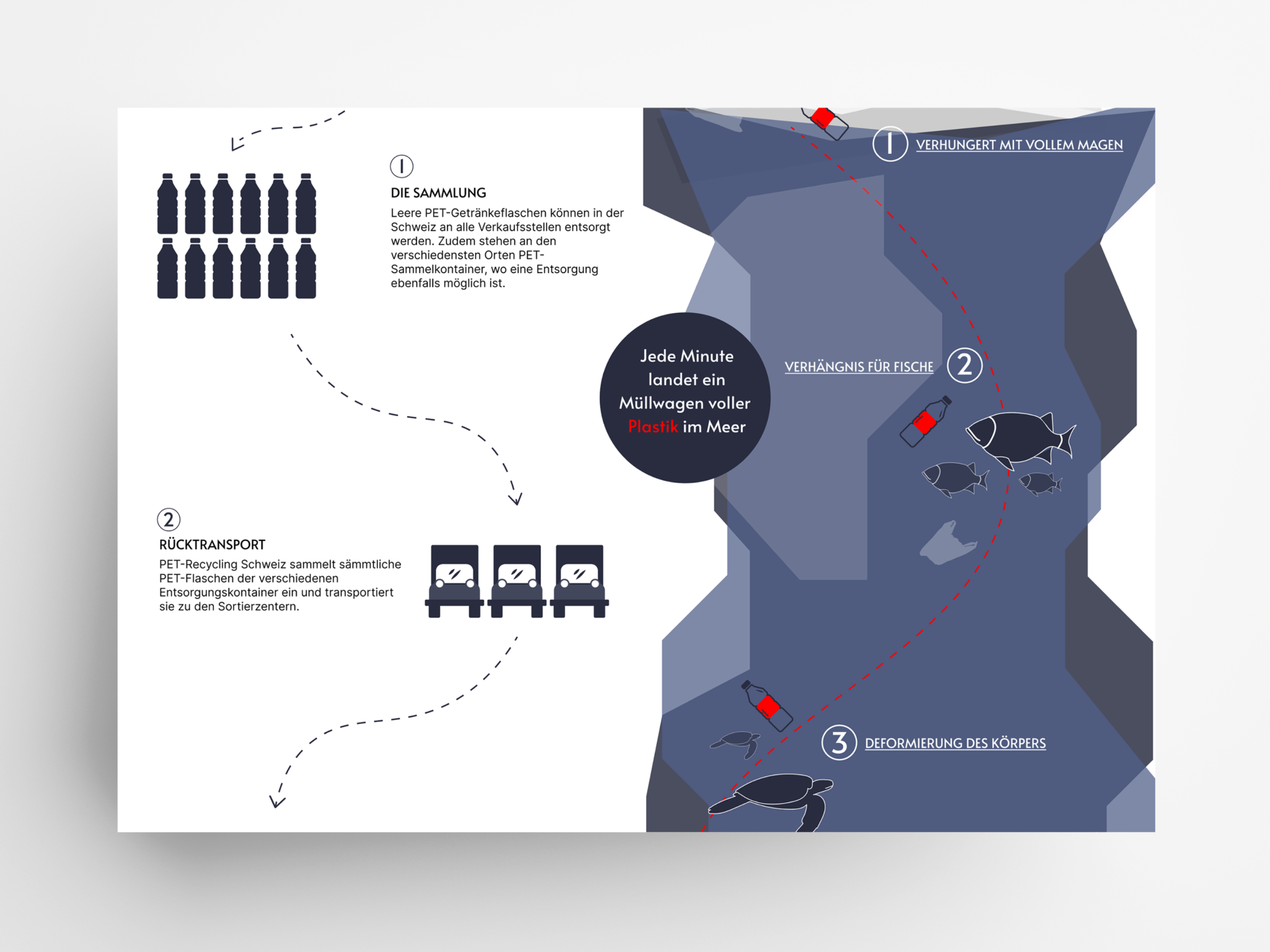 I started by researching the problem of plastic waste in the world's oceans and its impact on wildlife. Based on these findings, I developed the concept for the infographic, which shows the two possible paths of a PET bottle after use.
